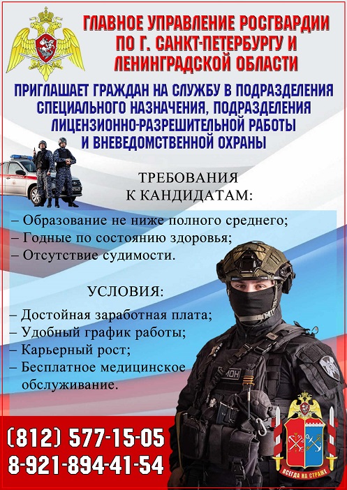Главное управление Росгвардии по г.Санкт-Петербургу и Ленинградской области приглашает на службу по контракту (в т.ч. военную):