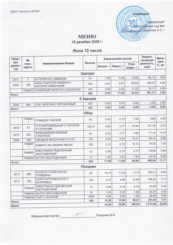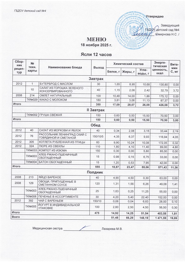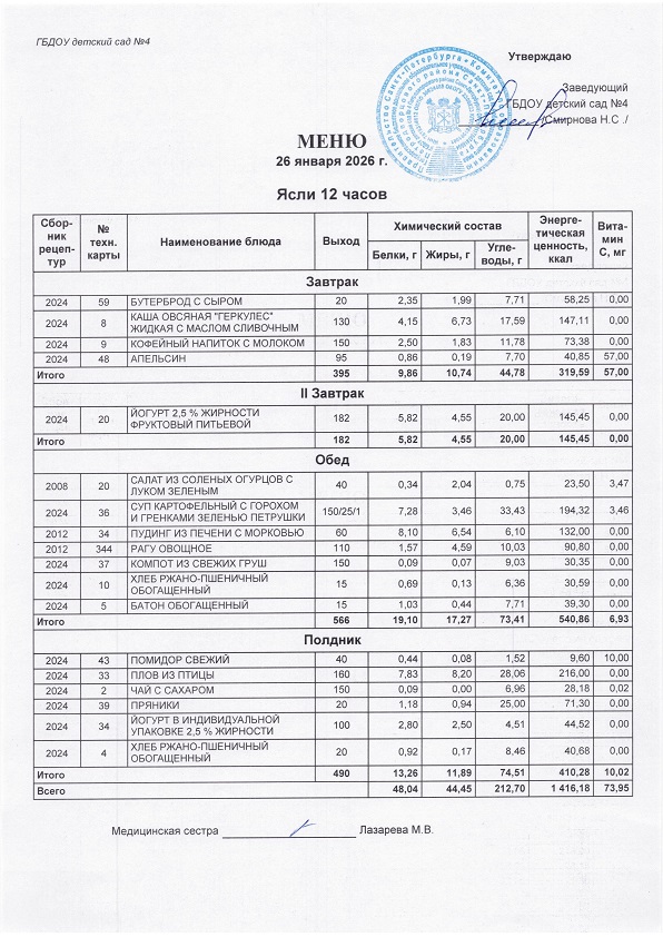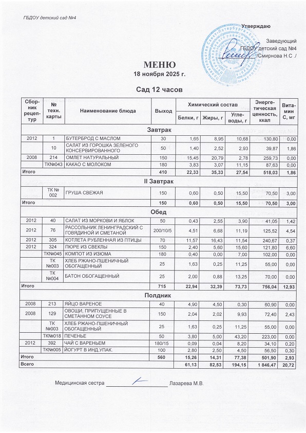 Питание в ГБДОУ детском саду № 4 Петродворцового района Санкт-Петербурга организовано в соответствии с Санитарно-эпидемиологическими правилами и нормами СанПиН 2.3/2.4.3590-20 "Санитарно-эпидемиологические требования к организации общественного питания населения", утвержденными постановлением Главного государственного санитарного врача РФ от 27.10.2020 № 32, цикличным 10-ти дневным меню для организации питания детей в возрасте от 1,5 до 3-х лет и от 3-х до 7 лет, посещающих дошкольные образовательные учреждения с 12-ти часовым режимом функционирования.