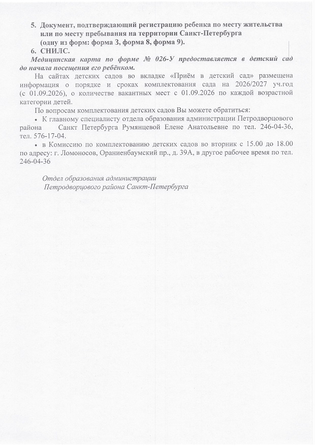 Прием детей в ГБДОУ детский сад № 4 Петродворцового района Санкт-Петербурга осуществляется на основании направления, выданного Комиссией по комплектованию ДОУ Администрации Петродворцового района Санкт-Петербурга, по адресу: Ломоносов, Ораниенбаумский пр., д.39а, вторник с 15.00 до 18.00